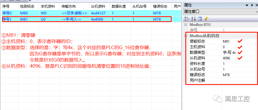 序号1 :检测标志M81,M81作为显示屏上对电机位置的清零键;本机资料G0,表示将清零的数据通过寄存器G0直接写入到电机驱动器里面,从而实现清零的操作;传输方向是写入,也就是写入清零的数据,因为用的是G0寄存器,所以是单字节的写入方式;从机资料4x4096。(详细说明,见下方进制换算的解说)