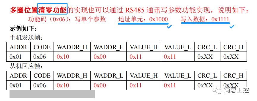 多圈位置清零:伺服驱动器对应的清零地址单元是0x1000,清零写入的数据是0x1111。