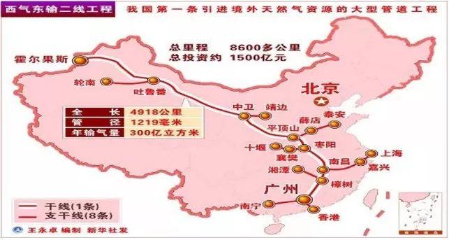西气东输二线天然气管道(简称西二线)包括1条干线、8条支线。干线起自新疆霍尔果斯市,止于广东省广州市,长4918km,管径1219mm,设计压力12MPa,设计输量300亿m3/a。支线长约3760km。2012年底全线投产。