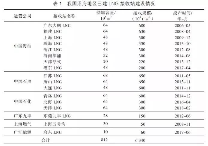 截至2018年2月,我国东南沿海已建成17座LNG接收站,储罐容量812万m3,总接收能力达6340万t/a,分别由中国海油、中国石油、中国石化和部分私营企业投资建设。其中,建成最早的LNG接收站是广东大鹏LNG接收站,最新建成的LNG接收站是中国石化天津LNG接收站。各接收站建设情况详见表1。