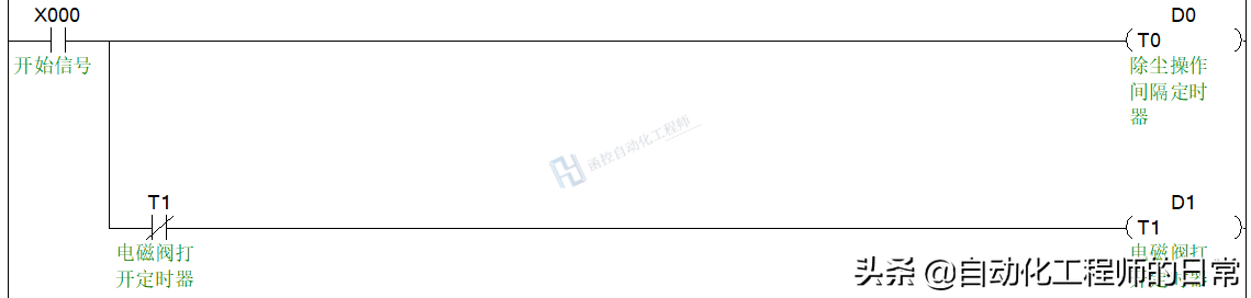 启动布袋除尘器后,开始除尘操作间隔定时,同时开启脉冲电磁发切换定时。其中,定时时间分别通过D0和D1寄存器设置。