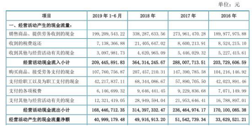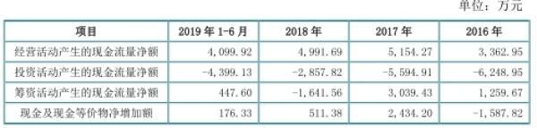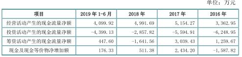 2016年至2019年6月30日,公司经营活动产生的现金流量净额分别为3362.95万元、5154.27万元、4991.69万元、4099.92万元。