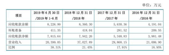2016年至2019年6月30日,四会富仕应收账款余额分别为4191.04万元、5630.36万元、8360.30万元、8226.99万元,应收账款净额分别为3981.48万元、5348.83万元、7942.26万元、7815.64万元,占营业收入的比重分别为18.95%、17.91%、21.45%及38.31%。