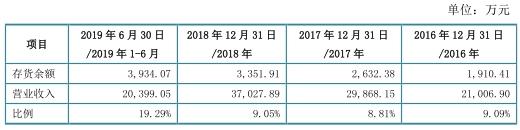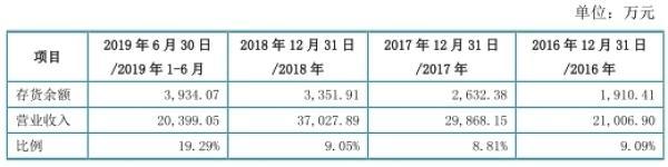 2016年至2019年6月30日,四会富仕存货金额分别为1910.41万元、2632.38万元、3351.91万元、3934.07万元,占营业收入的比例分别为9.09%、8.81%、9.05%、19.29%。