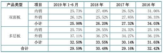 2016年至2019年1-6月,公司双面板销售金额6755.40万元、1.02亿元、1.52亿元、8903.60万元,分别占主营业务收入的32.33%、35.02%、41.80%、44.68%;多层板销售金额1.41亿元、1.90亿元、2.11亿元、1.10亿元,分别占主营业务收入的67.67%、64.98%、58.20%、55.32%。