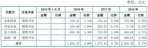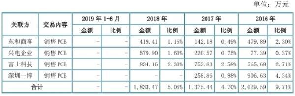 据招股书,2017年,东和商事、兴电企业、富士电路、一博电路将其持有公司的股权全部对外转让,不再是公司关联方;2019年1-6月公司与上述公司的交易金额分别为223.81万元、277.21万元、502.37万元、0万元,合计占主营业务收入的比例为5.03%。