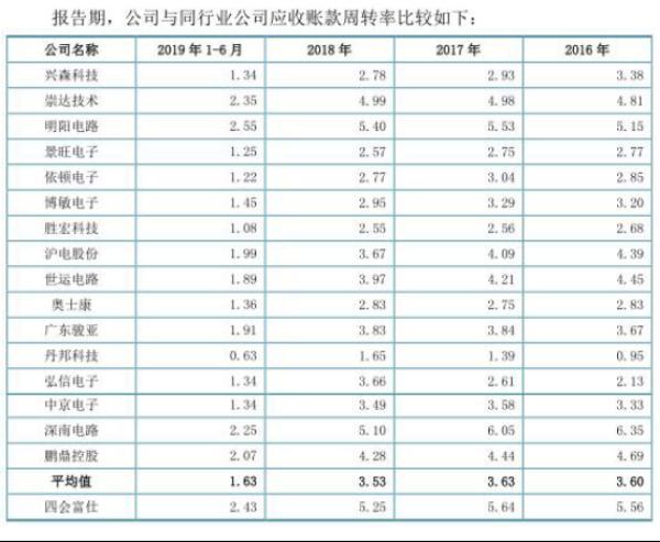 报告期内,四会富仕应收账款周转率分别为5.56、5.64、5.25、2.43,高于同行业公司应收账款周转率平均值3.60、3.63、3.53、1.63。