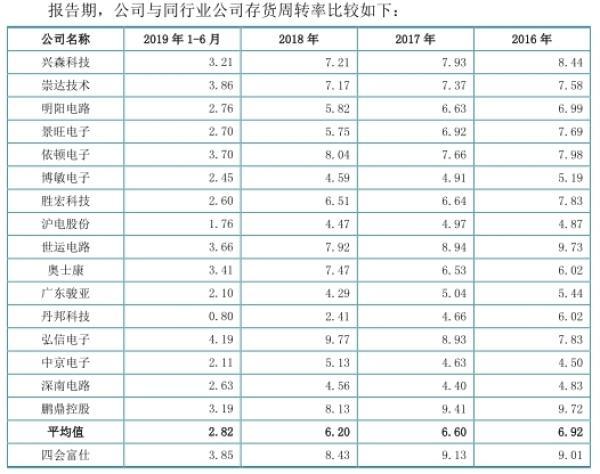报告期内,四会富仕存货周转率分别为9.01、9.13、8.43、3.85,高于同行业公司存货周转率平均值6.92、6.60、6.20、2.82。