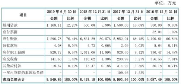应付账款金额分别为3400.61万元、5952.01万元、6831.29万元、7296.78万元,占流动负债的比例分别为66.84%、66.18%、80.57%、76.41%。