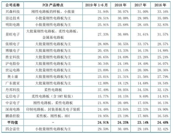 2016年至2019年1-6月,四会富仕毛利率分别为32.42%、29.16%、30.48%及29.59%,高于同行业可比公司平均水平。同行业可比公司毛利率平均值分别为24.48%、23.14%、24.25%、24.91%。