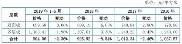 2016年至2019年1-6月,四会富仕双面板销售价格分别为770.90元/平方米、748.84元/平方米、699.19元/平方米、699.58元/平方米。