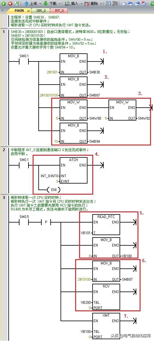 中断子程序INT_0用于恢复 SMB87 的设置(SM87.7 = 1),并执行 RCV 指令开始接收 CPU2的应答信息。程序如图4. 所示: