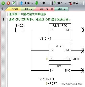 中断子程序INT_0用于读取 CPU 实时时钟,并调用 XMT 指令将实时时钟信息发送出去。程序如图所示。