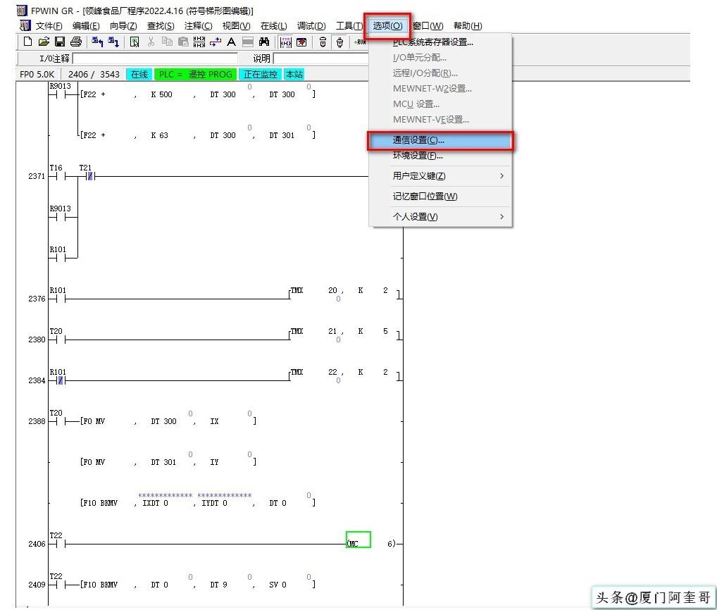 打开FPWIN GR软件,点击选项,选择通信设置。