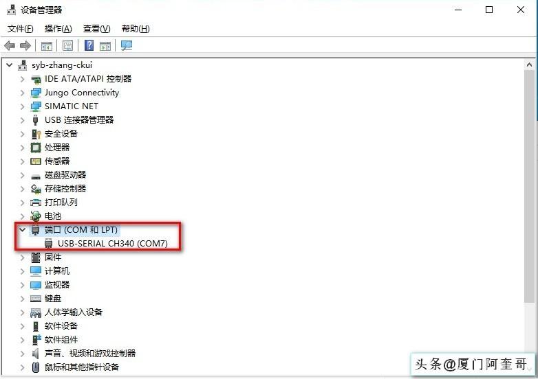 4、打开我的电脑-设备管理器,查看我们通信线所占用的端口号,如下COM7口。