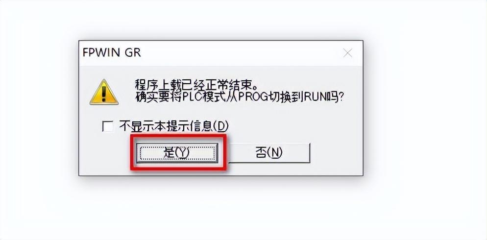 9、上传完成后,会弹出对话框提示“程序上载已经正常结束。确实要将PLC模式从PROG切换到RUN吗?”,点击“是(Y)”按钮。