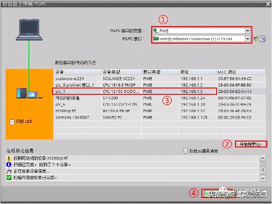 2、在“将设备上传到 PG/PC”对话框中执行以下操作