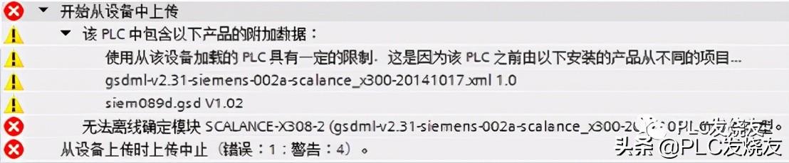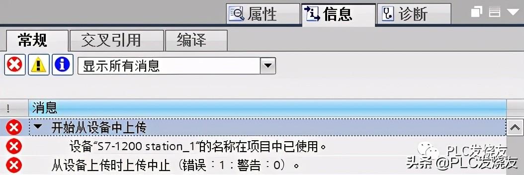 2、 执行将设备作为新站上传时报错需确认离线项目中没有配置与在线 PLC 相同名称的站点,否则上传失败。