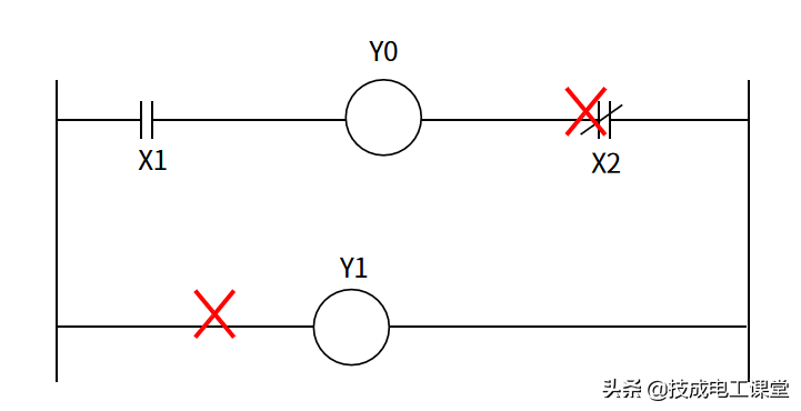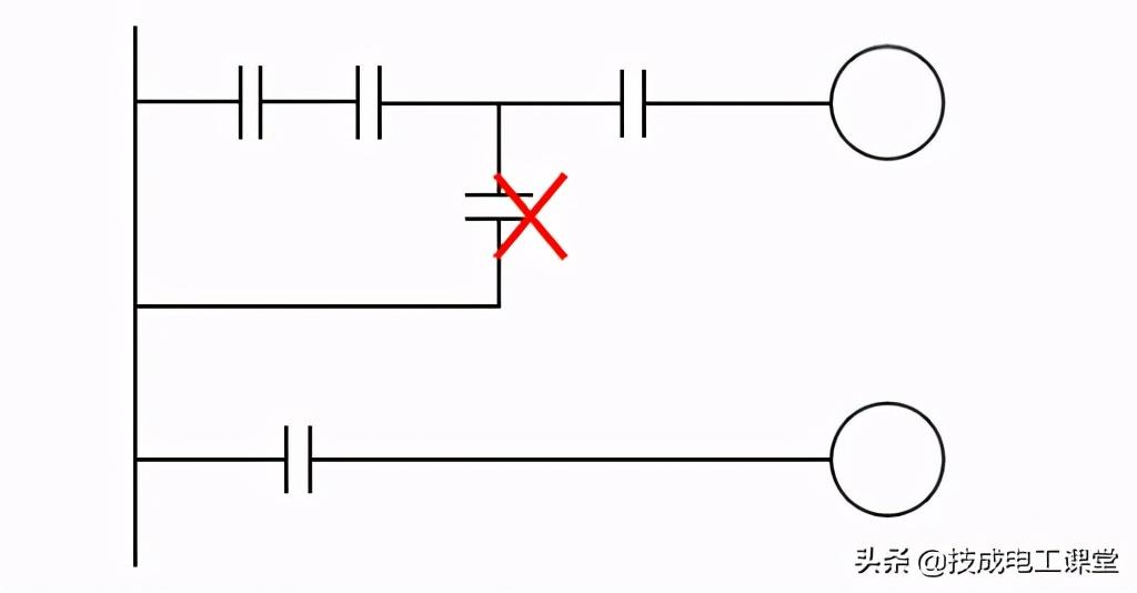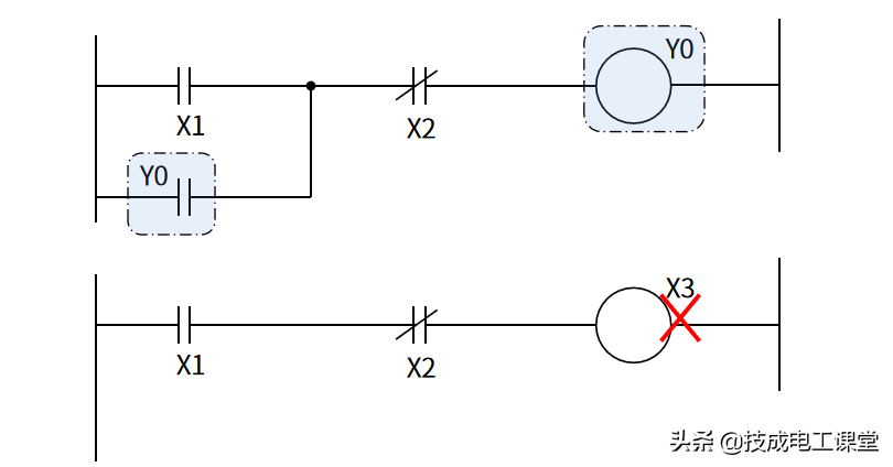 1、 触点不能接在输出线圈的右边;输出线圈也不能直接与左母线相连,必须通过触点连接。如下图所示。