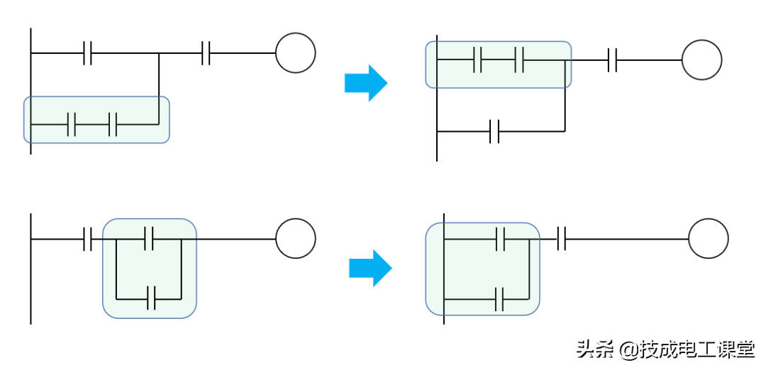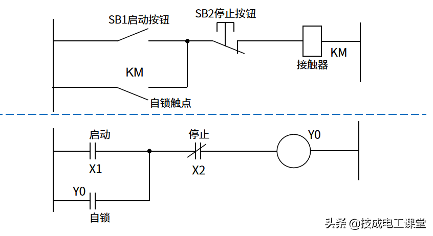 梯形图是源自继电控制系统电气原理图的形式,所以两者很相似。电气原理图中的一些继电器、接触器等配菜的符号,会经过翻炒出锅(简化),来到PLC梯形图。