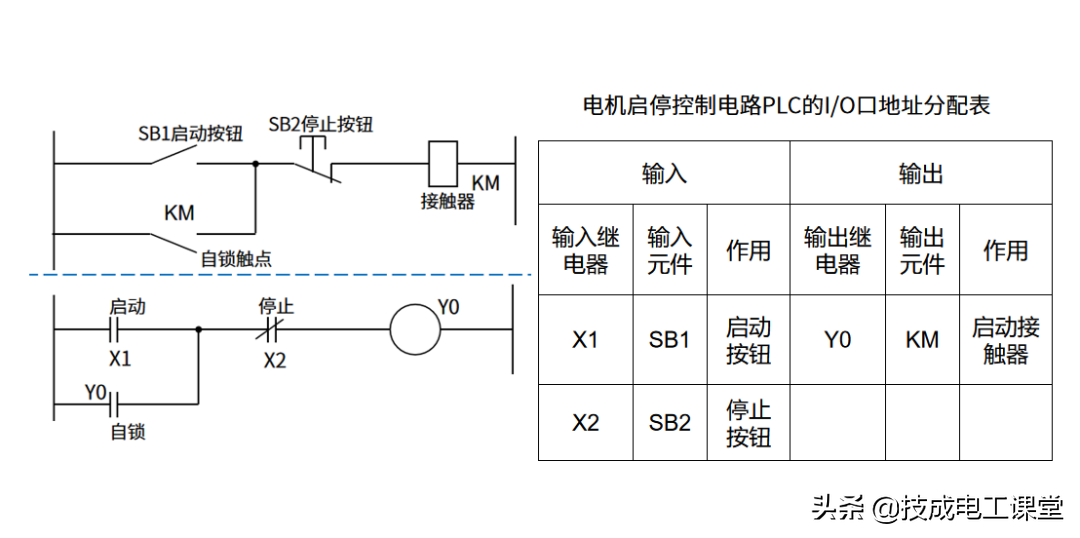 这时候就要用到PLC的I/O口地址分配表了,这个分配表就像是PLC调兵遣将(调用各个编程元件)的名单,从这个分配表上我们可以知道小虾X0用作什么,小蟹Y0去到哪里等。例如上图就是电机启停的继电控制图转化为梯形图,并制出其相应的I/O口地址分配表。