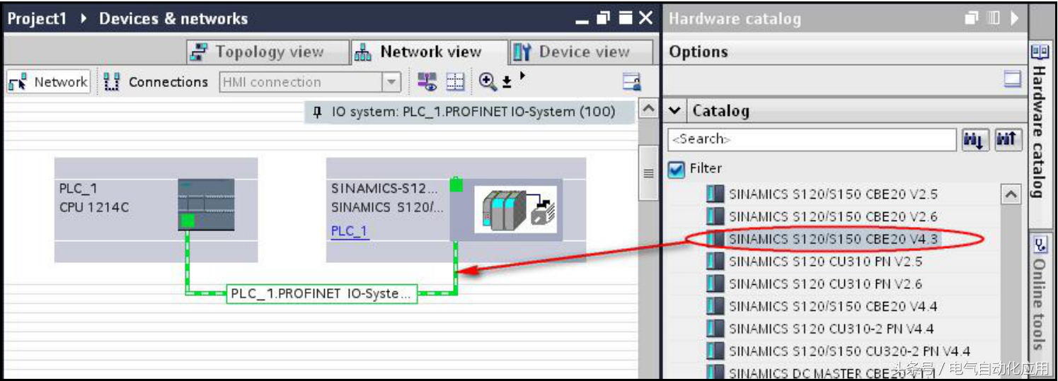 首先打开软件,选择好PLC后进入网络视图,在右侧的库文件里找到PROFINET-DRIVERS-Siemens AG-SINAMICS找到合适的驱动