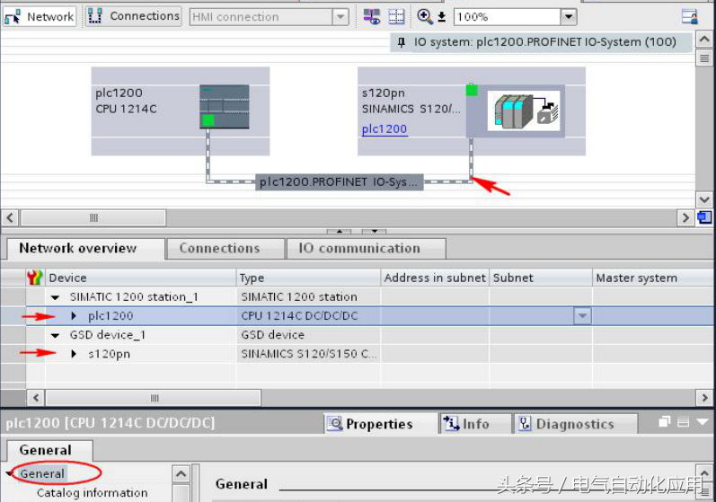 “SIMATIC 1200 station_l”和IO设备“GSD device1”。点击网络视图中的 S7-1200 PLC,在下面的属性窗口中,修改其Device Name为“plcl200”,同样,修改S120