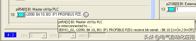 即将P854 Master ctrl by PLC 参数对应r2090 bit 10,即DB1.DBX0.2