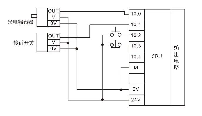 直流有源输入输入信号一般都是24V,这类信号与其他无源开关量信号混合接入PLC输入点时电压的0V点一定要接。上图输入点I0.0,I0.1连接光电编码器,接近开关的输出OUT信号,它们的驱动电源由PLC自身的24V电压提供