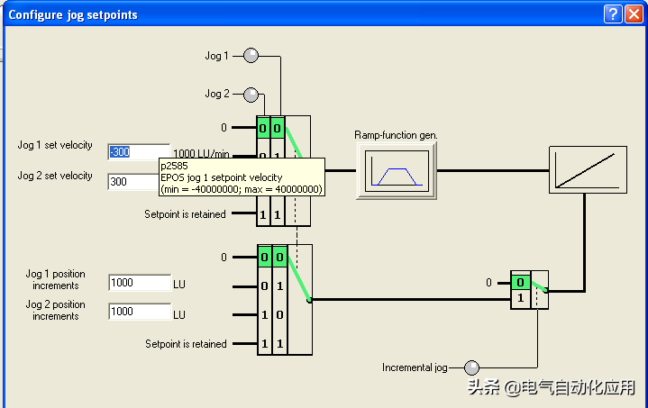 在Configure jog setpoints画面中设置JOG1和JOG2的速度和位置