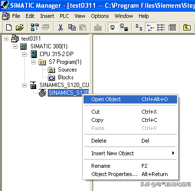 打开STEP7,此时会出现SINAMICS S120 CU320,点击Open Object打开S120项目。