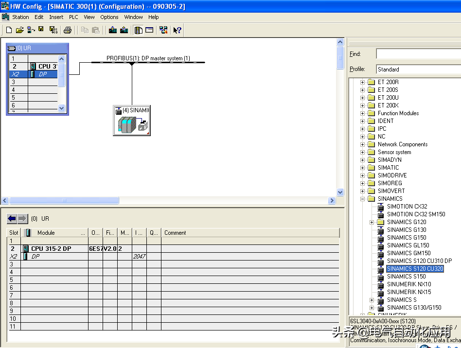 打开硬件组态,新建DP NETWORK,在CATALOG中选择相应S120产品,如SINAMICS S120 CU320,将其加入DP总线,DP地址设置应与驱动侧设置地址一致。