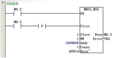 程序段3:通信写控制命令。指定从站(变频器)地址slave,读写操作RW(0为读1为写),控制命令地址(Addr),个数Count,DataPtr缓冲区。等地址。其它参数不做介绍,重点讲解Addr(16#BC41)如何得来的,变频器中地址通常以十六进制形式给出2000H,那么需要转换成十进制为8192,再与40001相加等于48193,再转成十六进制等于16#BC41。