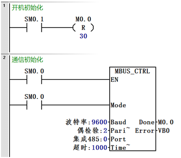 程序段2:利用modbus库中提供的初始化对通信口进行初始化,指定波特率,校验位,端口,超时时间等参数。