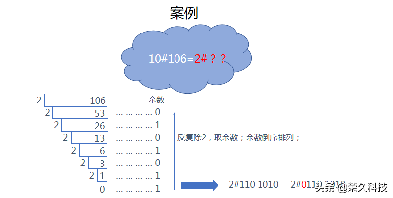 方法:十进制数除2取余法,即十进制数除2,余数为权位上的数,得到的商值继续除2,依此步骤继续向下运算直到商为0为止。