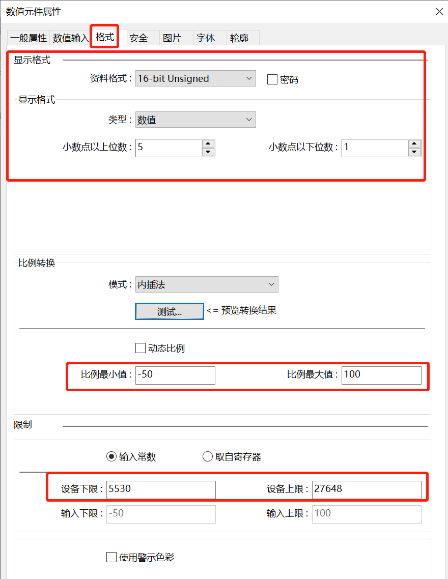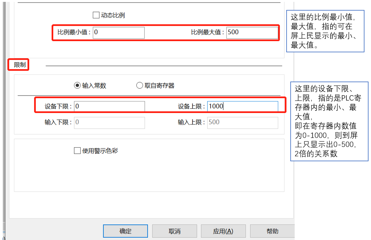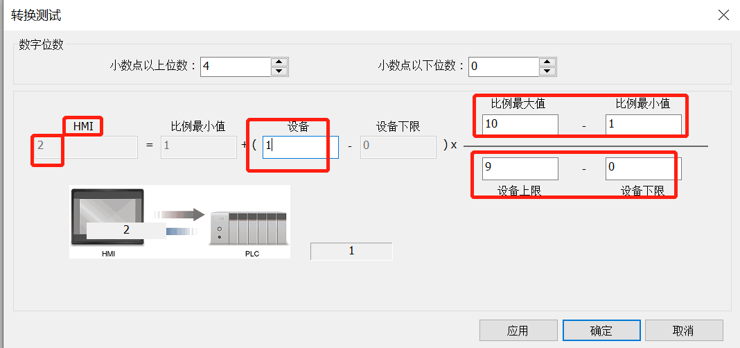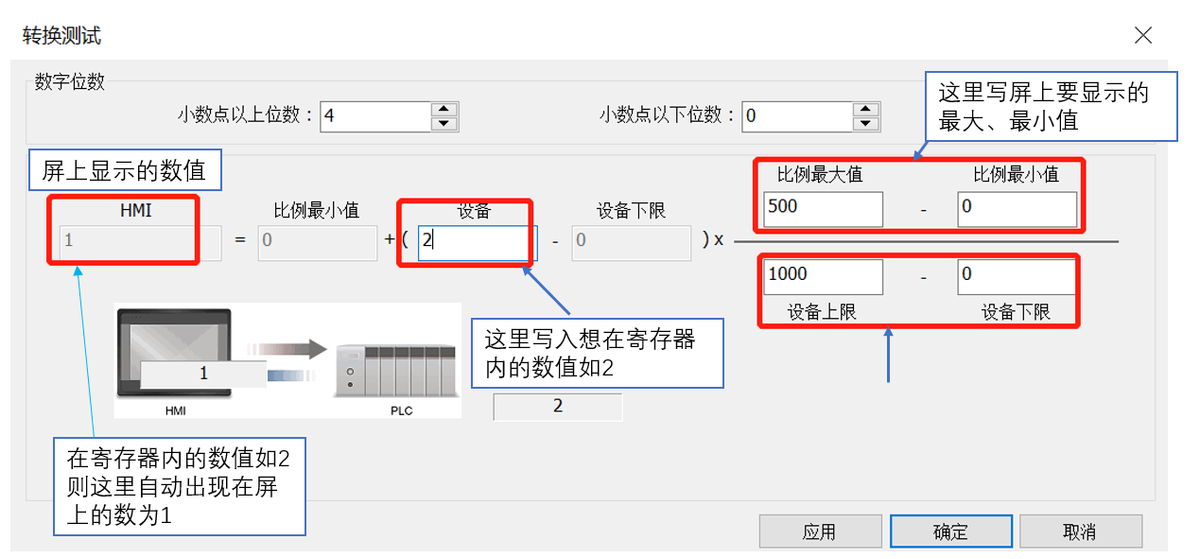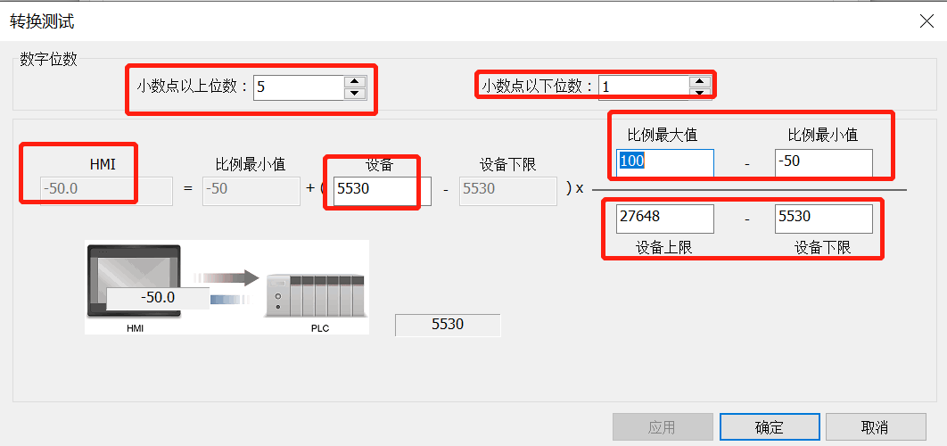 如寄存器内的数为整数,则数据类型选16位或32位的无符号或有符号整数。如屏上想显示为小数,则设置小数点以下位数1位或2位或更多根据寄存器内的数值大小,确定小数点以上位数,注意负号-也算一位。如(-3256),则位数为5位。设备上、下限值——根据PLC寄存器内的数值范围,填写设备的上限与下限,如,温度测量,整数范围为(27648------5530),则设备上限写27648,下限为5530.比例最大、最小值——根据需要转换的目标值来填写。温度测量范围为100----30度,则比例最大、最小值填写为100、30例如:给【设备】——即PLC寄存器的目标值,填写为5530,则自动测试在HMI上显示为30或30.0