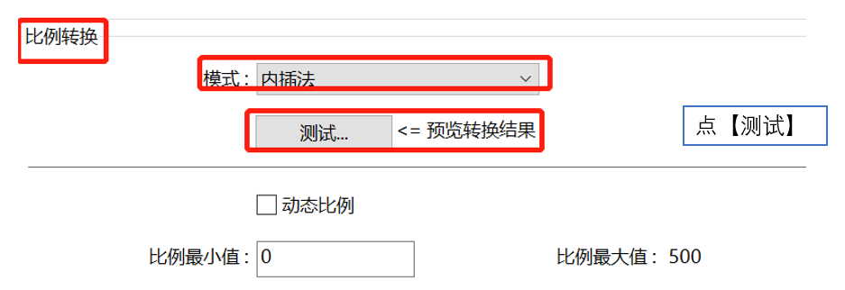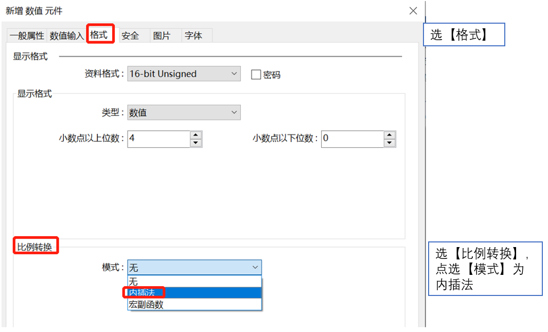 数值换算比例设置方法:打开【数值】元件属性设置,选【格式】,选【比例转换】--选【内插法】