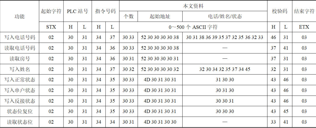 图4中,起始字符(STX)为对应的十六进制数02H,接收方以此来判断传输资料的开始;PLC站号为两位十六进制数,永宏PLC的站号可以将其设置为1~255,即为对应的1H~FFH;指令号码为两位十六进制数,根据不同的指令,可以实现不同的功能。