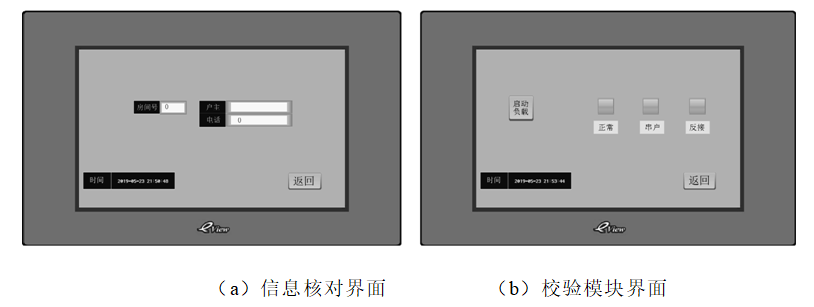信息核对模块包含信息输入以及户主信息查询,完成后的信息核对界面如图9(a)所示。其中,房间号可以由用户输入或者通过扫码枪扫入信息,CPU模块采集到相应数据之后,通过数据库匹配将户主姓名缩写以及电话号码返回并显示。完成后的校验模块界面如图9(b)所示,主要实现信号发生以及结果显示的功能。一旦用户点击“启动负载”,即可启动串户检测,待CPU模块分析完成后将结果返回,并使得对应结果信号灯由绿转红。