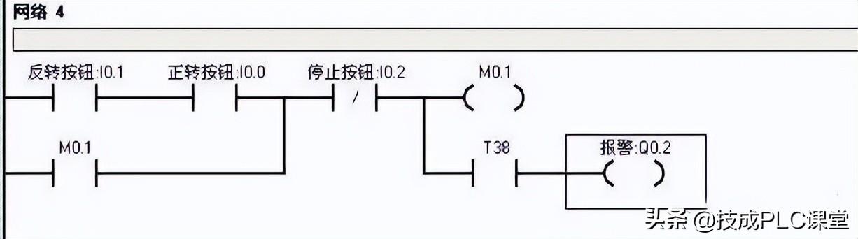 首先在2个自保持回路中加入互锁电路——网络1的Q0.1常闭点和网络2的Q0.0常闭点。题意2说按下停止按钮后5秒,才能按启动按钮,所以网络3按下I0.2停止按钮后,M0.0得电自保持,计时器T37计时5s后,将M0.0的自保持回路停掉。并且在网络1和网络2中加M0.0的常闭点,使M0.0得电时网络1和网络2即使按了正转按钮或者反转按钮也不会使Q0.0或Q0.1得电。