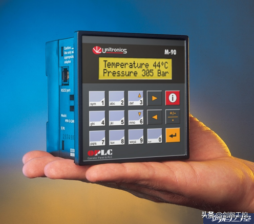 图7 Unitronics公司的M90/M91 这个可以放在掌心的袖珍形设备内集成了14~24个I/O点的微型PLC和一个带键盘的操作显示面板,因而被称为All-in-One(集成一体化)。在操作显示面板上我们可以看到有一个LCD液晶显示器,它是一个可以最多显示1行或2行16个字符(带背光)的文本显示器。在操作显示面板下面有15个密封隔膜按键,通过键盘可对M90/M91进行信息通信并修改现有数据。主机本身可带的I/O点数从14点到24点;加I/O扩展模块后,可连接最多8个I/O模块,可扩展最多64个I/O点;多达63台M90/M91可通过总线连接成一个网络。部分型号可接受1~2个模拟量输入信号,1个模拟量输出信号,可实现PID回路控制。带RS232串行端口,支持GSM功能。在PC机上进行梯级图编程、操作显示面板编程。OPLC体积小巧、价格低廉、功能丰富。特别适合于随小型设备配套的PLC采用。特别新潮的是,它还配有无线发送和接收含固定文本和变量数据的SMS短信息功能。我一方面感觉它价格更低,更适合用作闪光信号报警器的主机,另一方面我对具有SMS短信息无线传输功能更感兴趣。