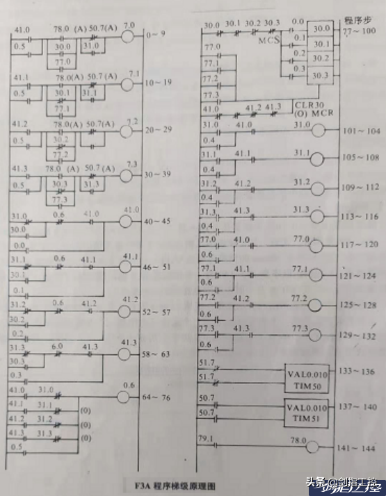 在上世纪70年代后期,随国外引进工程配套的PLC进入中国,我在昆明工作,信息相对闭塞,但1982年,当时的冶金部在北京举办了一次PLC培训班,我院电气专业工程师参加了。1983年初,我院邀请代理美国德州仪器公司(TI)可编程序控制器产品的北京机械部自动化研究院的专家来昆明介绍PLC。1984年,在我院设计的昆明焦化制气厂的工程设计中,我们就选用了美国德州仪器公司中大型可编程序控制器PM550和小型可编程序控制器5TI。其中,PM550不仅具有逻辑控制功能,开关量最多可接入256点输入、256点输出,还具有PID回路控制功能,可实现最多16个PID回路控制功能。虽说当时还是上世纪80年代中期,但我还是能接受控制系统一体化的观念,在国内较早将我从事的自控专业与电气专业合作,选用一套PLC实现整个焦化厂的电气、自控两个专业的监控。由电气专业承担PLC的总体和开关量部分工作、我负责模拟回路、模拟量部分的工作。1986年焦化制气厂进入试车调试阶段,我院负责可编程序控制器PM550的现场编程、调试、投运工作。当时编程设备是一台VPU200显像式编程器。编程器及控制器随机带来的资料都是英文的,我提前几年自学的英文也派上用场,编程器的英文资料都是我翻译的。程序部分涉及电气、自控两个专业,自控部分也是我编写的程序,这个程序是采用逐项填写表格的方式,即填写回路编程工作单进行,然后在梯级图编写的程序中安排一段调用工作单的子程序即可(见图1)。