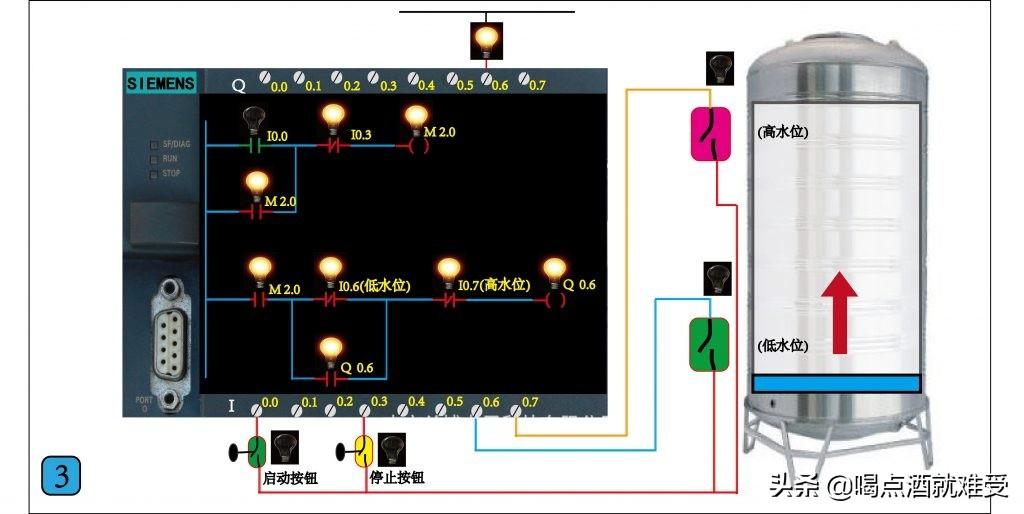 图3 ,的动作是虽然我们松开启动按钮,常开触点I0.0断开,但线圈M2.0依然是通的,这因为有常开触点M2.0的自锁。所以Q0.6依然是有输出的,水泵继续补水运行。