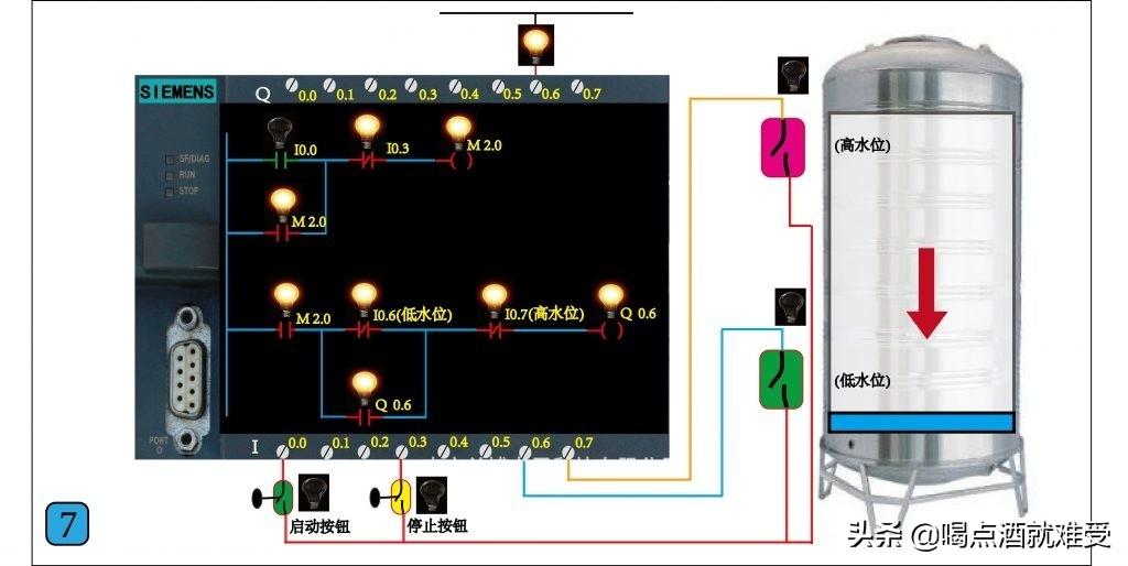 图7 ,当水位下降到低水位开关时,低水位开关断开,常闭触点I0.6接通,因常闭触点I0.7也早已经接通,所以线圈Q0.6接通也就有了输出,并常开触点Q0.6接通,形成自锁。这时水泵启动运行补水,从而实现了水泵的自动运行。只要我们不按下停止按钮,水泵就会按照这个控制程序周而复始的自动运行。
