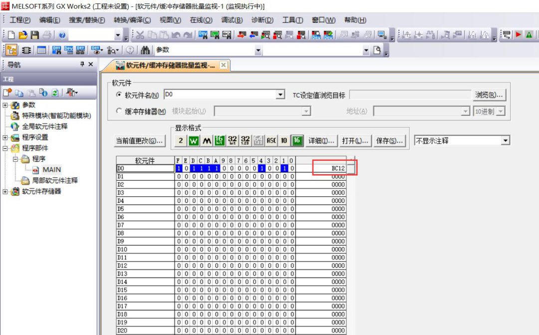 2. 打开 GXWork2 变量监视表,对 FX3U 的 D0 进行数据监视,值为 BC12H;