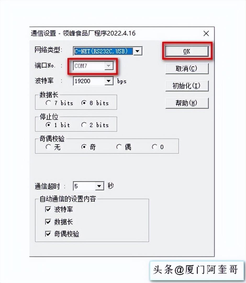 5、端口No.:选择COM7,其它默认:波特率19200,数据长8,停止位1 bits,奇偶校验奇。然后点击OK,完成设置。