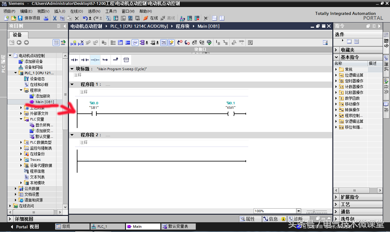 第八步:打开项目树中的“程序块”文件夹,双击打开“Main[OB1]”主程序块,在该块中编写梯形图程序。编程的步骤与STEP-7基本相似,这里就不再一一赘述了。