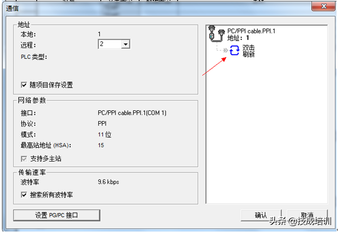 第五步:点击双击刷新,选择搜索到的PLC,点击确定选择。