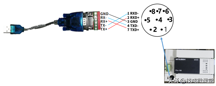 三菱PLC的连接口是422的,它可以兼容RS485的连接,因此但是就按照下图,拿了几根比较硬的细线,完成了连接,连接图纸如下。