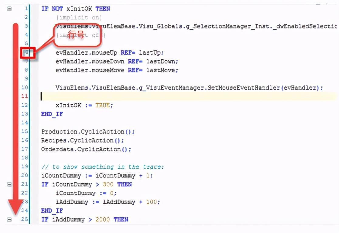 使用结构化文本的程序执行顺序根据“行号”依次从上至下开始顺序执行,每个周期开始,先执行行号较小的程序行。